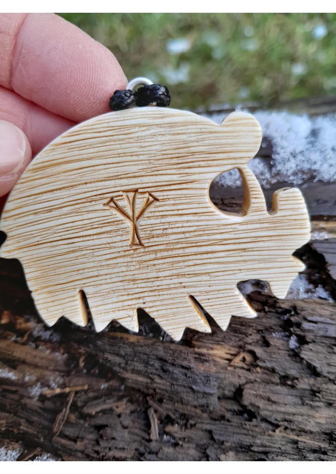 This handcrafted boar amulet, carved from moose antler, reflects Viking-inspired artistry. Featuring a natural green gemstone in the boar’s eye, it symbolizes courage, resilience, and protection. Whether worn as a meaningful charm or displayed as a personal treasure, this amulet combines tradition, beauty, and purpose.