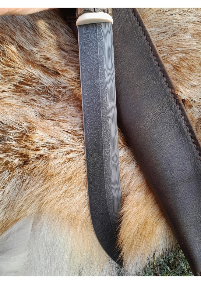 Handmade Viking scramasax features a hand-forged Damascus steel blade, renowned for its strength and intricate patterning. The handle is made from an ancient animal's fossilized bone (20-40 thousand years old) and moose antler. A hand-carved moose antler bead is in the center of the handle and is inlaid with silver. Complete with a handcrafted leather sheath, this scramasax is perfect for collectors, reenactment enthusiasts, or anyone seeking an authentic Viking-inspired tool.